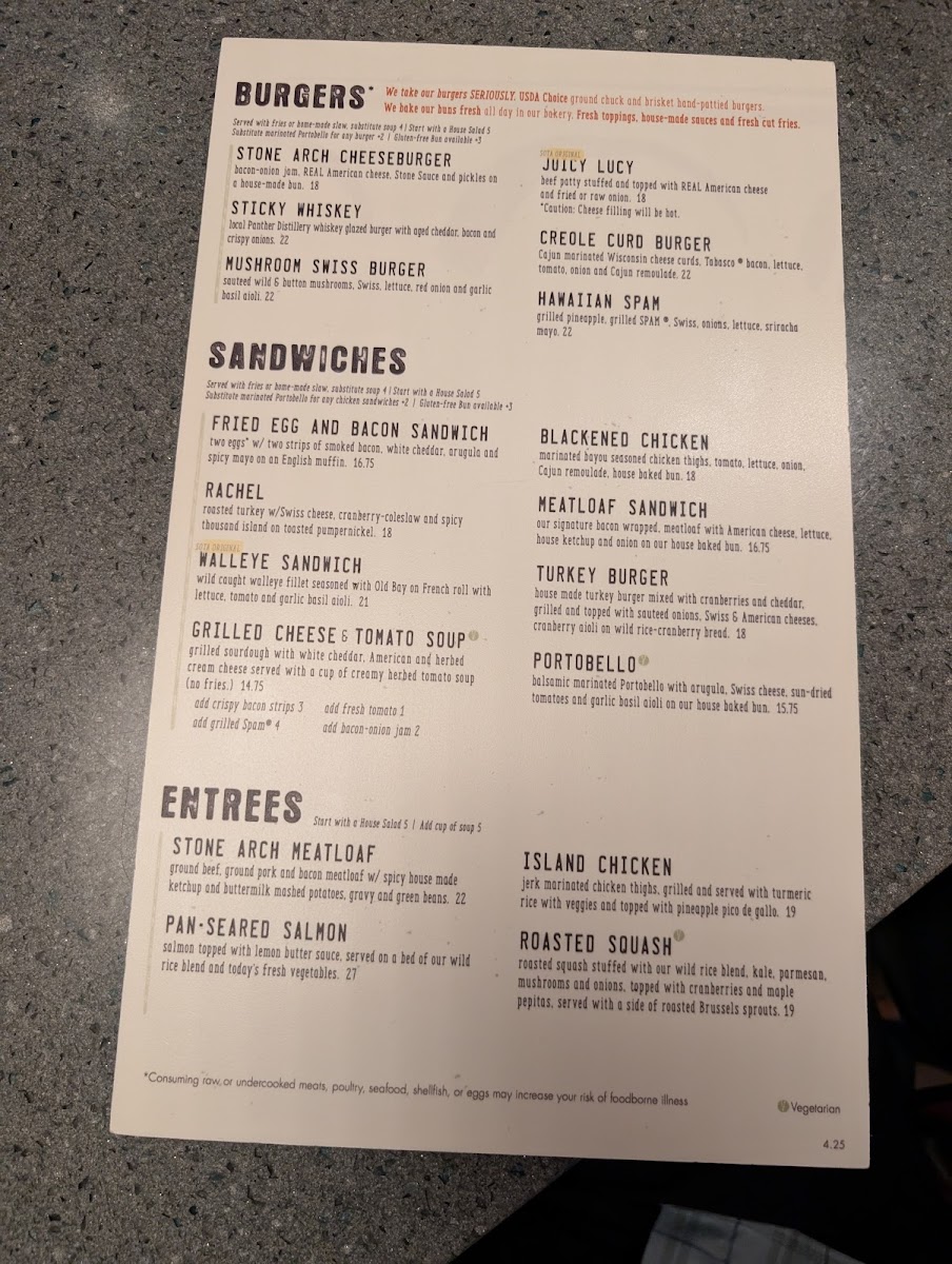 “ Stone Arch is located right after clearing security at the MSP airport. Super handy if your flight departs from the F or G concourses. It offers a wide variety of tables and seating - everything from bar stools to tables and booths. It has a peaceful vibe even when it is busy. I had breakfast here today. The Egg and Bacon sandwich with hash browns was excellent. The bacon was crisp and so flavorful. The eggs were done perfectly. The white cheddar, arugula, sauce, and English muffin worked magic together. One of the best Egg sandwiches I’ve had. Price point was great for airport cuisine. My partner got the avocado sandwich and gives it 5 out of 5 stars. She expected thicker sliced bread, but the portion turned out to be perfect. Our server was friendly and attentive even though it was quite busy. We had a great experience (though one of the guys cleaning tables when we arrived seemed to be in a snippy mood). Feeling like getting a full Minnesota experience? They offer fried Spam as a meat option on several items. I almost tried it. Almost. I will stop by again! PREVIOUS REVIEW (Still true) I got the walleye sandwich. It was excellent - way better than I expected from an airport restaurant. It was as good as walleye I’ve enjoyed up on Minnesota’s north shore. I highly recommend it. Ask for an extra side of tartar sauce as it is also very good - tastes great on the sandwich and on french fries. Their fries are perfectly cooked as well. I also found their ice tea freshly made. Easy listening pop music overhead drowns out the bustle of the airport. If you’re looking for a place to grab a bite, I highly recommend the Stone Arch (named after the famous Stone Arch Bridge that crosses the Mississippi in Minneapolis). ”